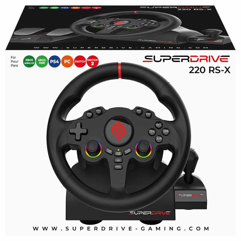 The 220 RS-X is a multiplatform steering wheel: compatible with Nintendo Switch 2, Switch, PlayStation 4 (PS4), Xbox Series X/S, Xbox One and PC (Windows).